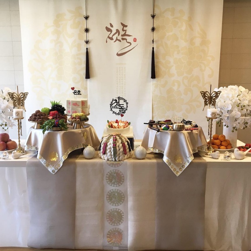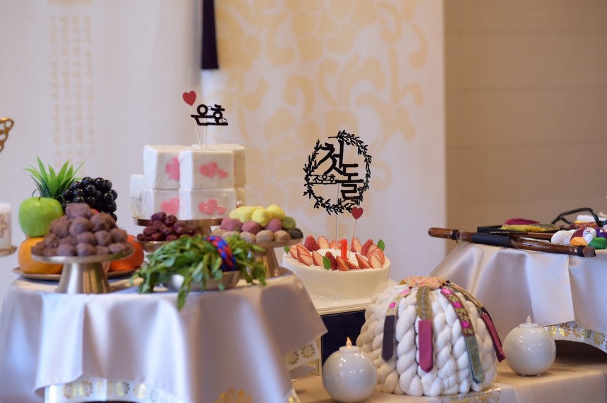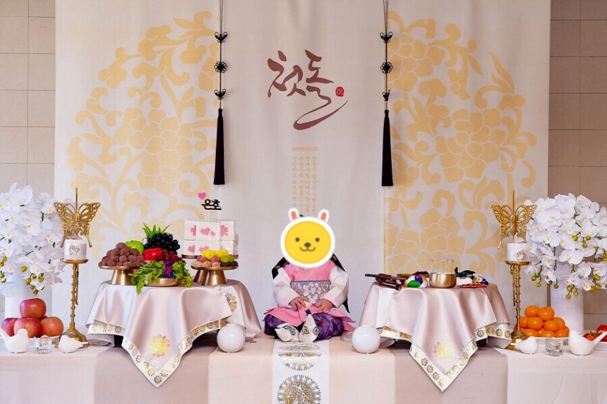저희 결혼식때 맞춘 한복하고 아가 한복 색도 찰떡같이 어울렸고 물론 상에 올린 케이크와 생과일 몇가지는 제가 따로 준비한거지만 ( 강강술래 늘봄농원점 테이블이 커서 준비해간거구요 보통 테이블에는 출장돌상업체에서 가지고 오신것만으로도 풍성하겠더라구요!) 상도 그득하고 예뻐서 넘나 만족했어요!!